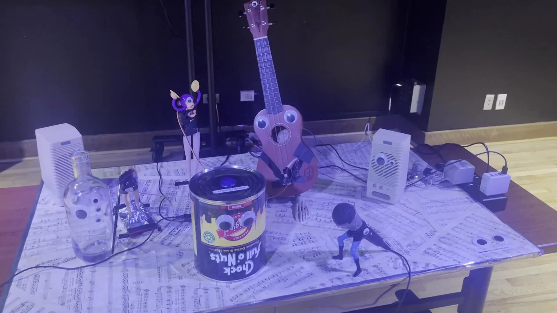 Installation using Raspberry PI running a granular synth, robots made from discarded toys assigned to certain frequency bands to ‘play along’